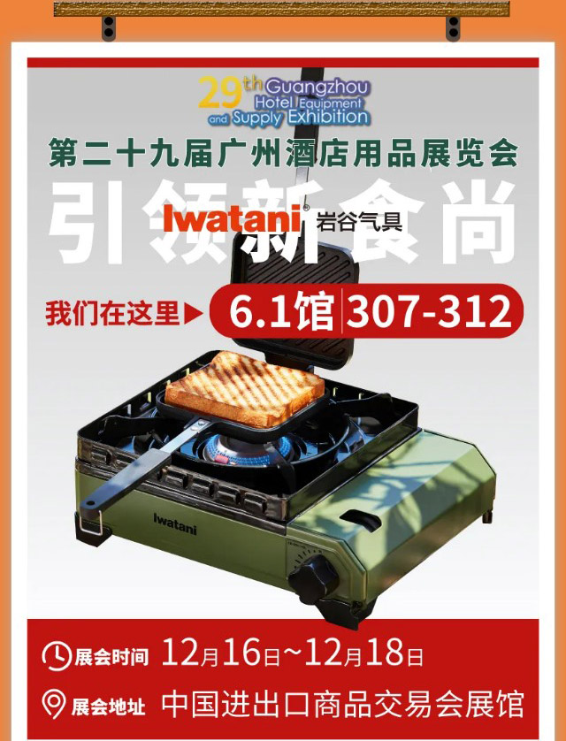 12月16-18日岩谷气具参展,2021年第二十八届广州酒店用品展览。 本届展会设立了八大主题展区,展览面积达35万平方米,聚集全世界5000多家高端展商。 岩谷气具展位坐落在A区1.1馆636-653。