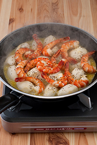 • 在蒸锅里抹上一层橄榄油,放入大蒜炒热,随后加芋头。浇一圈白葡萄酒,盖上锅盖。弱火蒸5-6分钟后放虾。