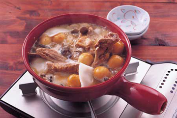 在步骤1内加入A(调味料)调味,再加入芋头,等煮入味后再适量加入口蘑和年糕。