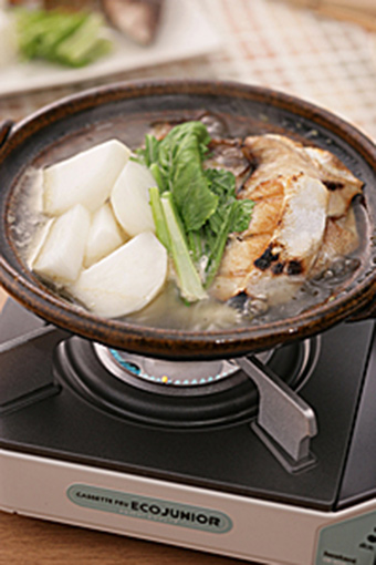 油甘鱼切成2段,在烤鱼网上迅速将两面烤至金黄